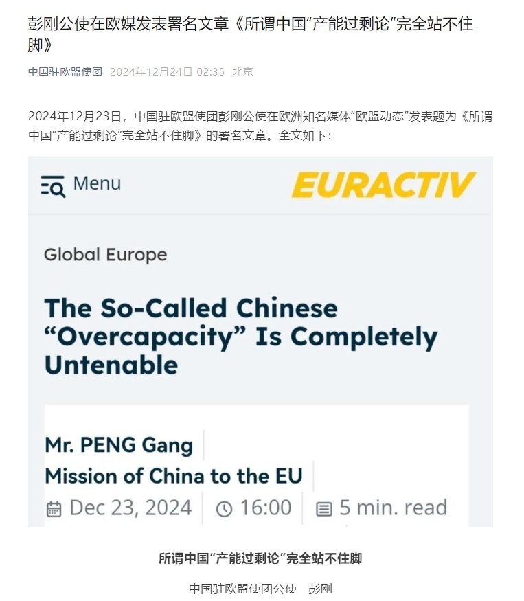 当地时候12月23日,针对近段时候以来,一些泰西政客和媒体再次炒作所谓中国“产能鼓胀论”,并将这种责问再行能源行业膨胀到更多工业品类,声称中国通过出口来消化鼓胀产能,冲击宇宙阛阓,中国驻欧盟使团彭刚公使在欧洲知名媒体“欧盟动态”签字著述进行复兴称,本色上,这一论调在销耗“产能鼓胀”宗旨,既不得当客不雅事实,亦有违阛阓经济限定。